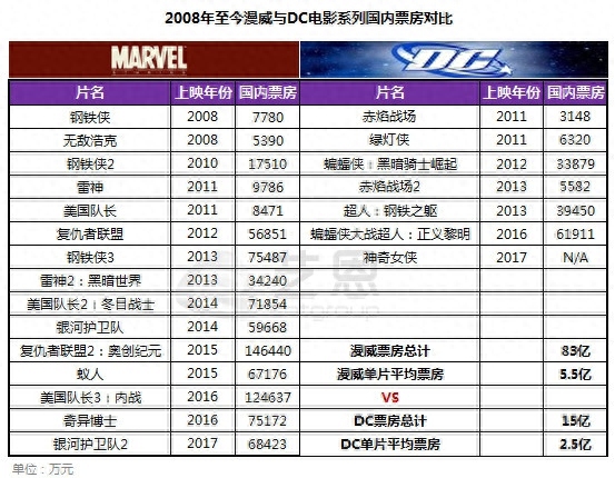 根据艺恩智库统计,从2008年至今,中国内地引进的漫威电影有15部,DC电影仅有7部。从票房来看,漫威这15 部电影创造的票房高达83亿,而DC已上映完的6部电影(不含《神奇女侠》)票房仅为15亿,漫威在中国内地的票房是DC的5倍!漫威这15部电影单片平均票房高达5.5亿,而DC的6部影片单片平均票房2.5亿。