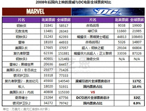 近9年来,漫威电影不仅在中国内地吊打DC,在全球的市场表现也胜过DC。漫威上述15部影片的全球票房高达117亿,而DC上述6部影片票房仅为32亿。虽然差距没有在中国内地市场那么大,但漫威电影在全球无疑比DC更受欢迎。